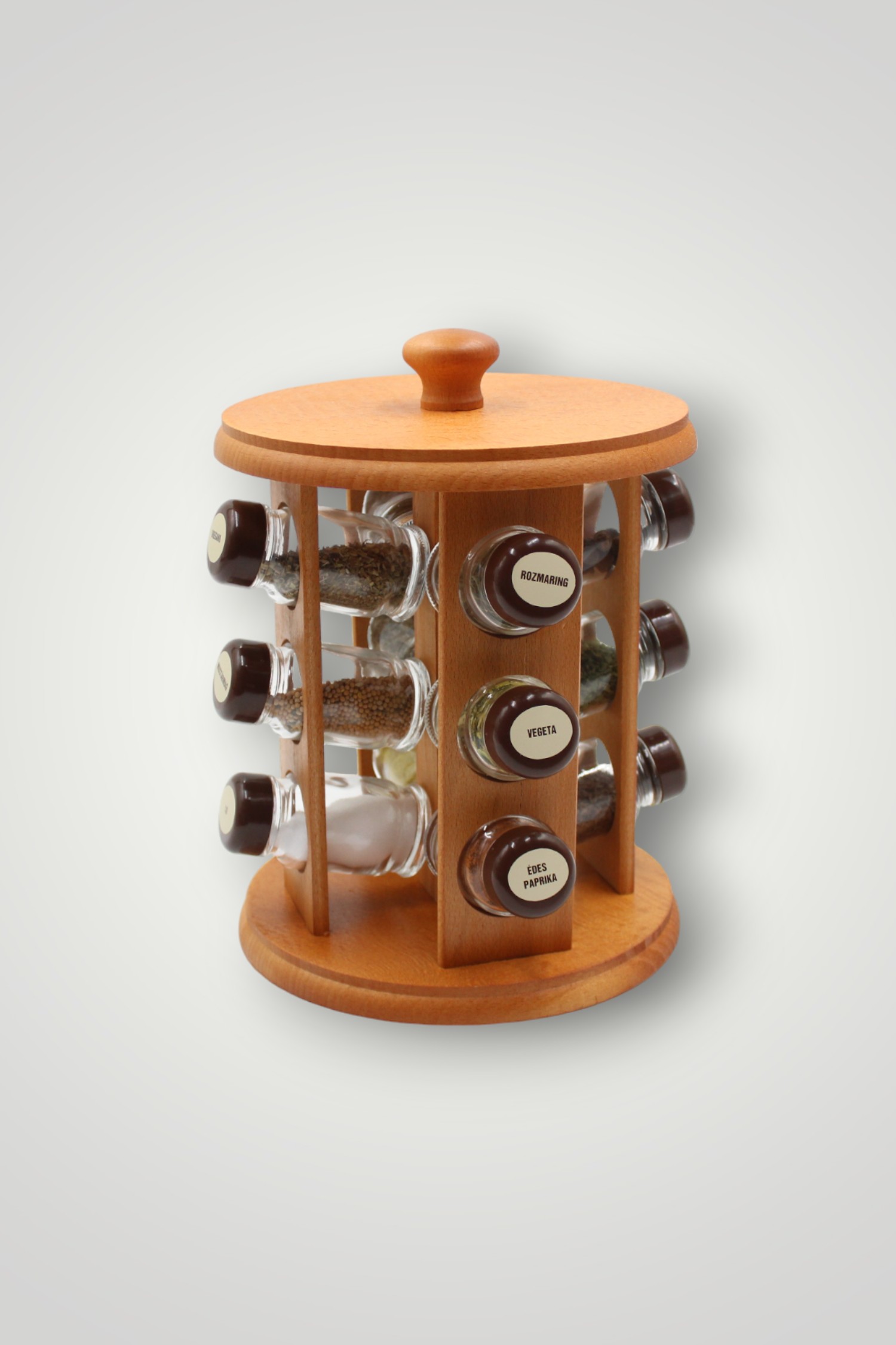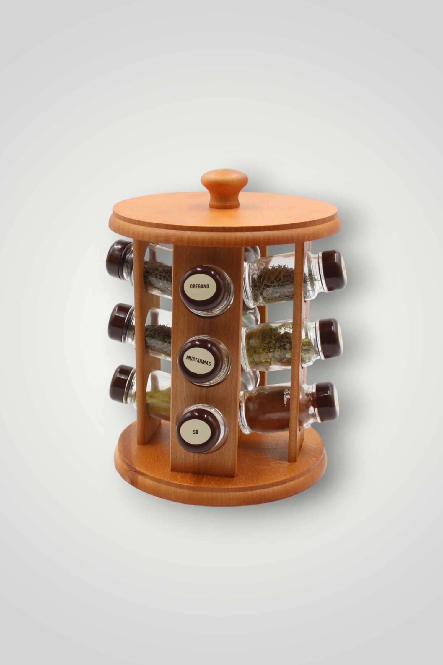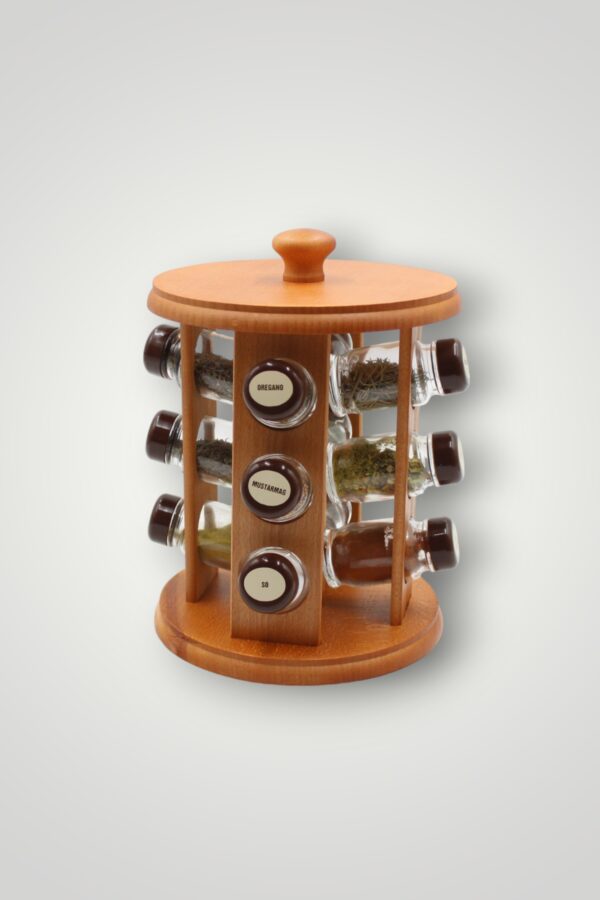 Setul conține condimente etichetate în limba maghiară. Suportul se poate roti.